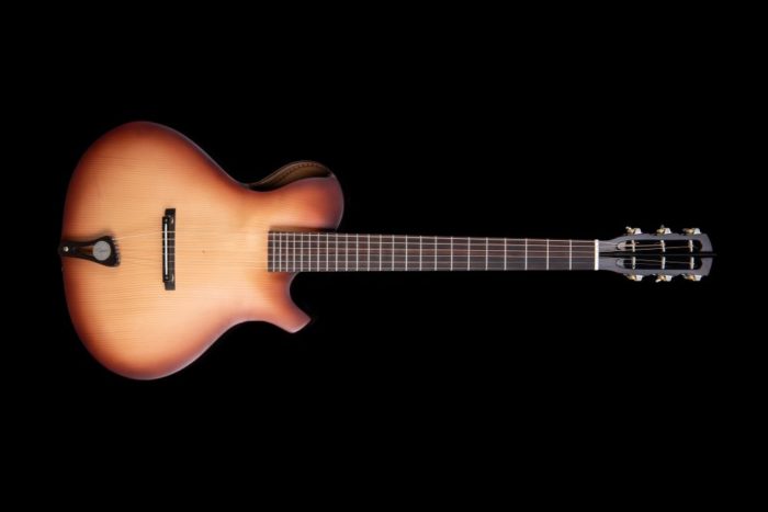 “Per i modelli TANGIER, proposti sia con corde nylon che in acciaio, la sfida è consistita nel dimensionare adeguatamente la cassa armonica, soprattutto in termini di spessore, per rendere il più ampio possibile lo spettro e la profondità timbrica dello strumento date le dimensioni ed il volume complessivo della cassa decisamente inferiori rispetto ad uno strumento classico, sia con corde in nylon che in acciaio. Va detto che lo strumento è stato concepito essenzialmente per un utilizzo in contesto amplificato via piezo ed in questa ottica è stato sviluppato fin da subito. Il progetto, per il resto, si riferisce alla tradizionale tecnica costruttiva di uno strumento archtop. Tavola armonica carvata a mano da legno massello con catenatura parallela. Le dimensioni del capotasto e del manico, che trovate esplicitate nelle schede tecniche dei singoli strumenti, sono state pensate per fornire al musicista un supporto che consentisse di poter spaziare agevolmente tra i diversi generi esprimibili sia attraverso uno strumento con corde in nylon che in acciaio, senza sacrificare o pregiudicare il feeling complessivo di un manico tradizionale. L’obbiettivo, che ritengo raggiunto, è stato quello di proporre uno strumento innovativo su base costruttiva e concettuale tipica delle chitarre di tipo archtop con uno sguardo, che mi auguro possa vernire apprezzato, al design innovativo”… Let’s Play“POPS” – Fondo e tavola armonica in pioppo nero, fasce in acero fiammato.“HABIBI” – Fondo e fasce in legno di tasso, tavola in abete. Corde nylon.“280SL” – Fondo e fasce in acero fiammato. Tavola in abete.“Dunes” – Semihollow cassa bassa. Body in mogano, top in abete.100’s – Abete, mogano. Soundport.